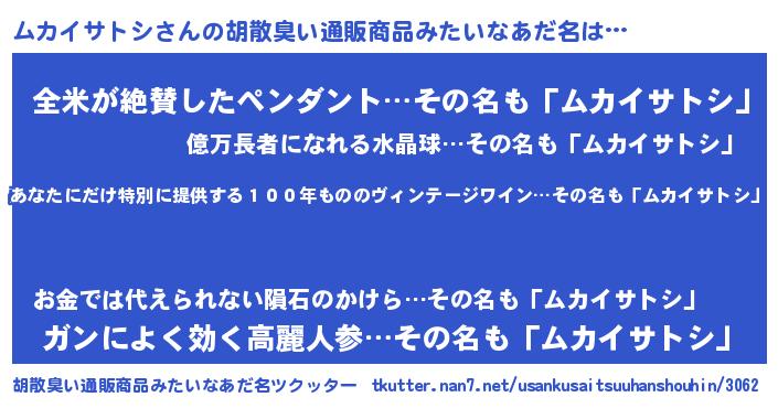 | 女子向けラノベタイトル風あだ名 | 『悪役ムカイサトシに転生したようですが、知った事ではありません』 |