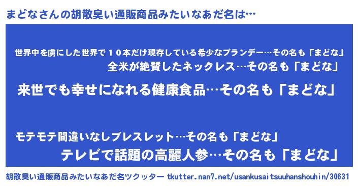 | 意味不明あだ名 | 『永久保存まどな』『なめこ科まどな属』 |