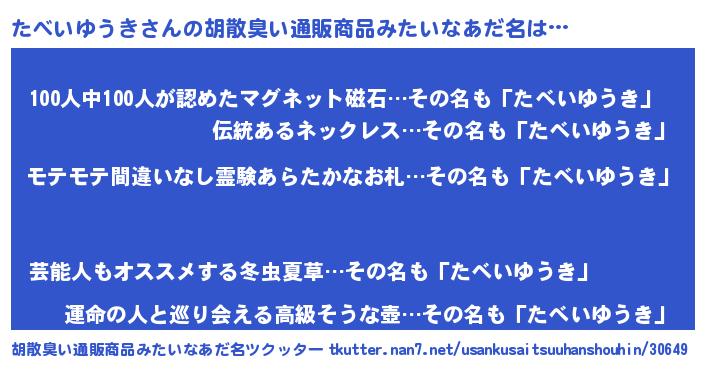 | 男性向けラノベタイトル風あだ名 | 『たべいゆうきの憂鬱』 |