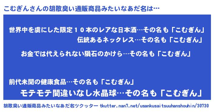 | ヘコむあだ名 | 『こむもー』『こむ太郎』『なまこ酢』 |