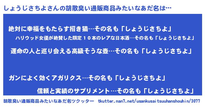 | 男性向けラノベタイトル風あだ名 | 『しょうじさちよ~年齢イコール彼女いない歴の魔法使い~』 |