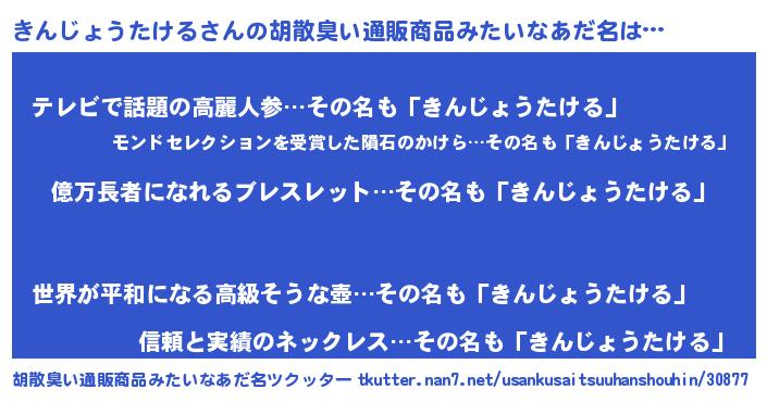 | 男性向けラノベタイトル風あだ名 | 『きんじょうたけるに滅ぼされるだけの簡単なお仕事です』 |