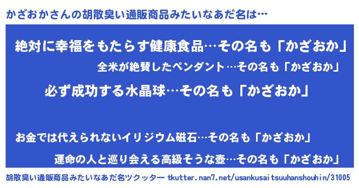 | ヘコむあだ名 | 『かざふぇ~』『かざおか(爆)』 |