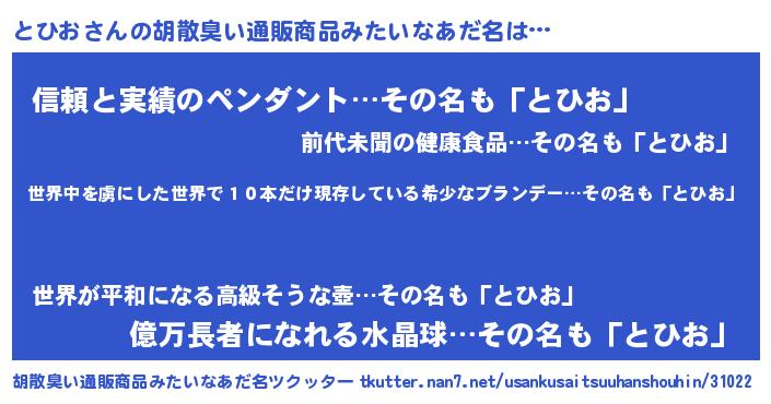 | 男性向けラノベタイトル風あだ名 | 『この素晴らしい世界にとひおを!』 |