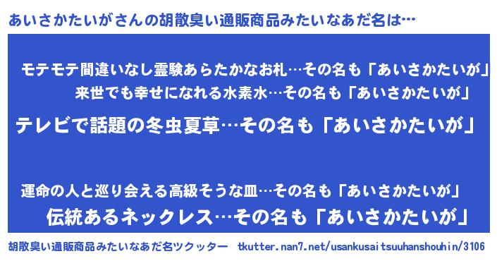 | 意味不明あだ名 | 『自称あいさかたいが』 |