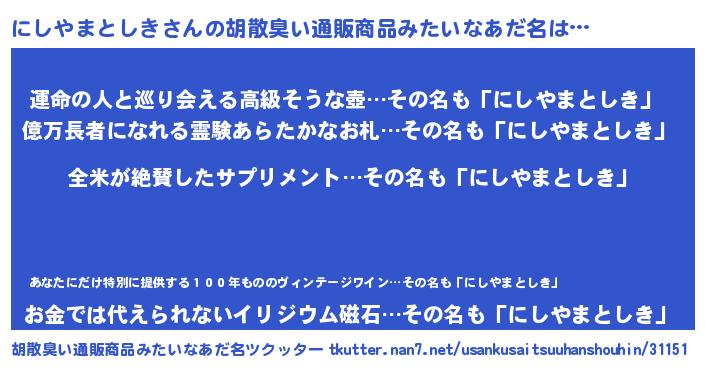 | 男性向けラノベタイトル風あだ名 | 『にしやまとしきの嫁は女の子じゃないと思った?』 |