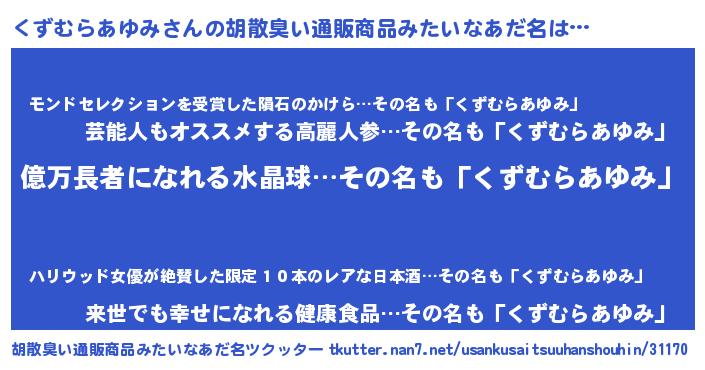 | ヘコむあだ名 | 『くずにゅー』『くずむらあゆみ(苦笑)』 |