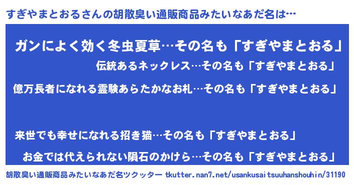 | 男性向けラノベタイトル風あだ名 | 『すぎやまとおる~年齢イコール彼女いない歴の魔法使い~』 |