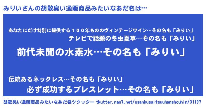| ヘコむあだ名 | 『みりい(苦笑)』『みりにー』 |