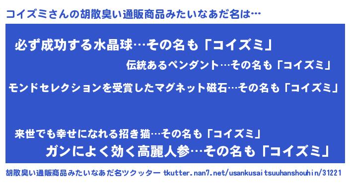 | 女子向けラノベタイトル風あだ名 | 『死神コイズミの再婚』 |