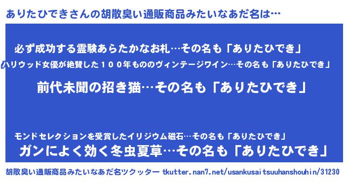 | ヘコむあだ名 | 『ありたひでき(笑)』『ありもー』 |