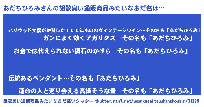 | 男性向けラノベタイトル風あだ名 | 『おまえをオタクにしてやるから、俺をあだちひろみにしてくれ! 』 |