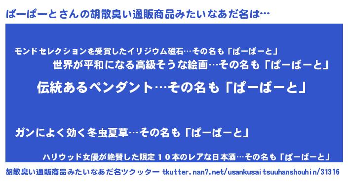 | 男性向けラノベタイトル風あだ名 | 『ぱーばーとの嫁は女の子じゃないと思った?』 |