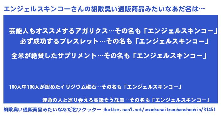 | 男性向けラノベタイトル風あだ名 | 『エンジェルスキンコーの嫁は女の子じゃないと思った?』 |