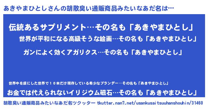 | 男性向けラノベタイトル風あだ名 | 『アキヤマヒトシスレイヤー』 |