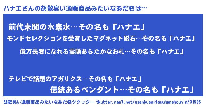 | ヘコむあだ名 | 『ハナっふぃ~』『ハナエ(震え声)』 |