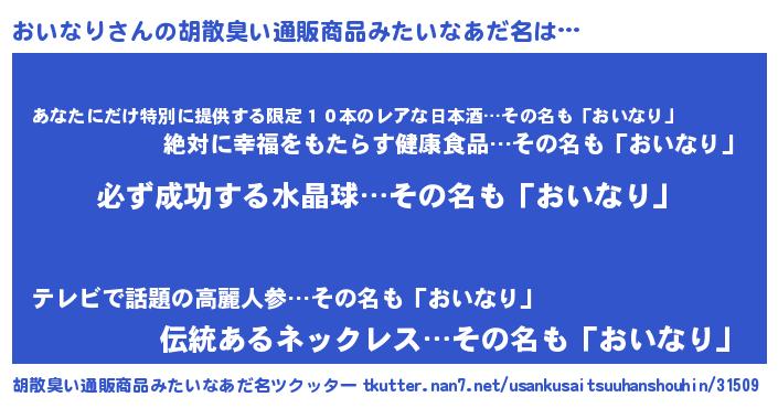 | 男性向けラノベタイトル風あだ名 | 『おいなりの憂鬱』『魔弾の王とおいなり』 |