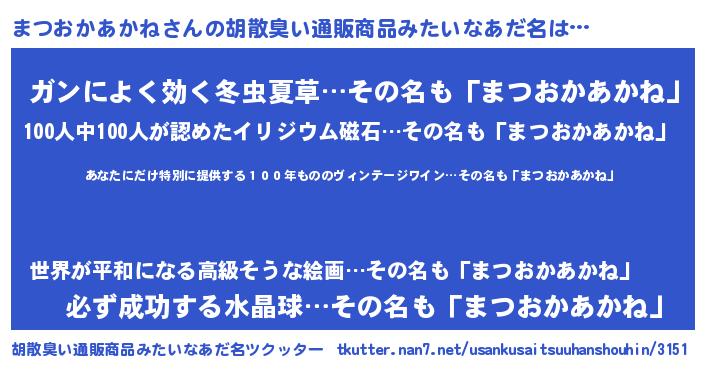 | 意味不明あだ名 | 『住所不定無職まつおかあかね(4歳)』 |