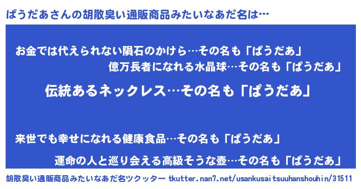 | 男性向けラノベタイトル風あだ名 | 『ダンジョンにぱうだあを求めるのは間違っているだろうか』 |