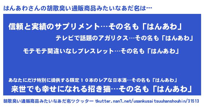 | 意味不明あだ名 | 『もやし科はんあわ属』『自称はんあわ』 |