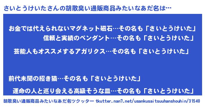 | 意味不明あだ名 | 『自称さいとうけいた』 |