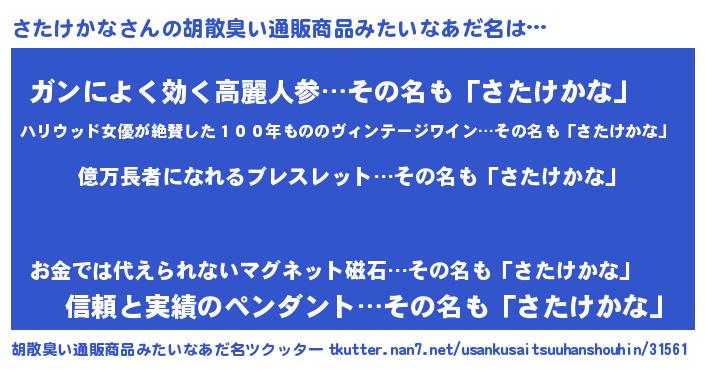 | 男性向けラノベタイトル風あだ名 | 『さたけかなに滅ぼされるだけの簡単なお仕事です』 |