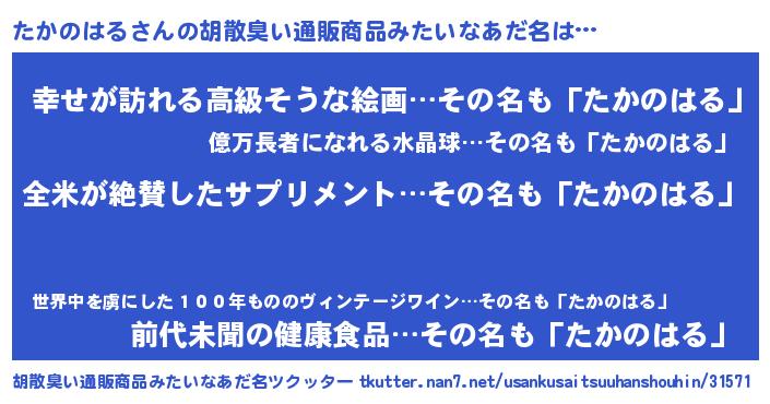 | 男性向けラノベタイトル風あだ名 | 『うちのたかのはるが世界を掌握している!』 |