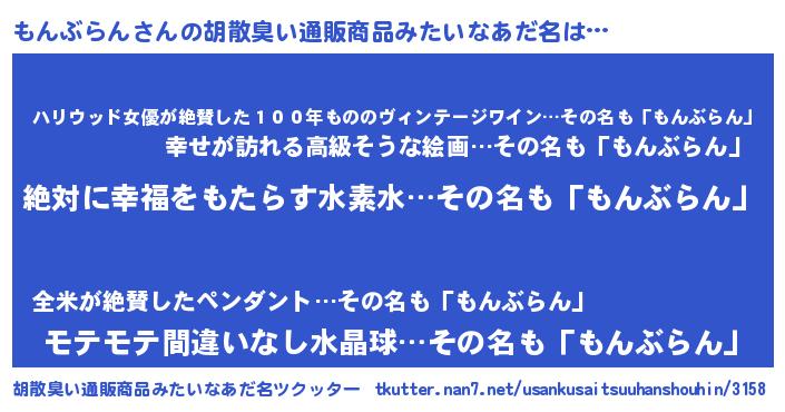 | 男性向けラノベタイトル風あだ名 | 『もんぶらんという概念が存在しない退屈な世界 』 |