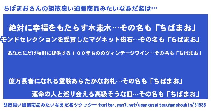 | 男性向けラノベタイトル風あだ名 | 『この素晴らしい世界にちばまおを!』 |