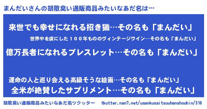 | 男性向けラノベタイトル風あだ名 | 『まんだいに滅ぼされるだけの簡単なお仕事です』 |