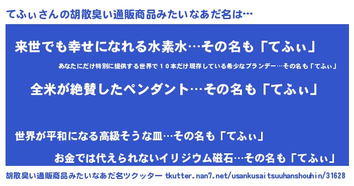 | 意味不明あだ名 | 『とにかく怪しいてふぃ』 |