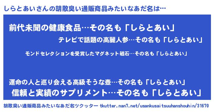 | 男性向けラノベタイトル風あだ名 | 『しらとあいに滅ぼされるだけの簡単なお仕事です』 |