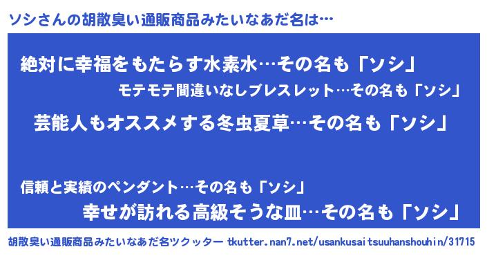 | ヘコむあだ名 | 『ソシ(苦笑)』『牛乳』『ソシもー』 |