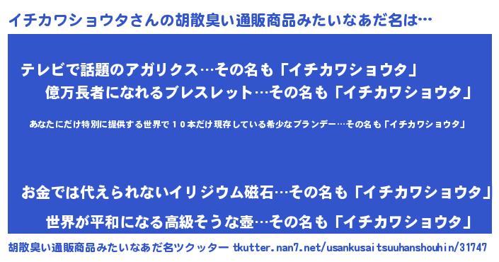 | 男性向けラノベタイトル風あだ名 | 『この素晴らしい世界にイチカワショウタを!』 |