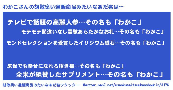 | ヒーロー風カッコイイあだ名 | 『慈愛の使者わかこ』『幻影騎士ワカ』 |