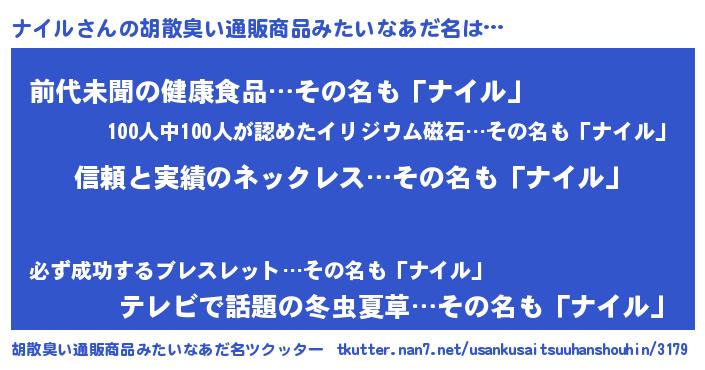 | 女子向けラノベタイトル風あだ名 | 『ナイルは平凡を望む』『ナイル恋絵巻』 |