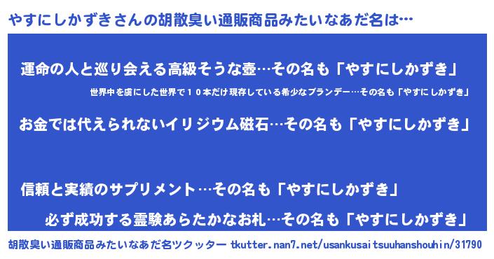 | 男性向けラノベタイトル風あだ名 | 『おまえをオタクにしてやるから、俺をやすにしかずきにしてくれ! 』 |