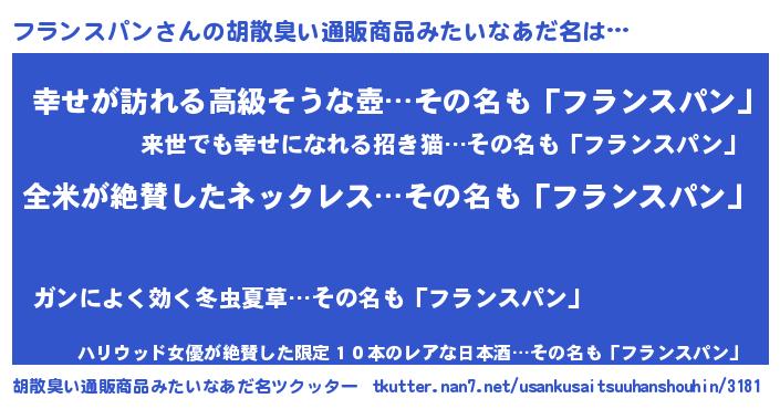 | 男性向けラノベタイトル風あだ名 | 『フランスパンの嫁は女の子じゃないと思った?』 |