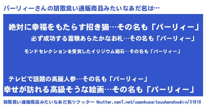 | 男性向けラノベタイトル風あだ名 | 『パーリィー~年齢イコール彼女いない歴の魔法使い~』 |