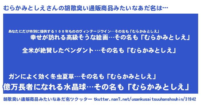 | 男性向けラノベタイトル風あだ名 | 『むらかみとしえの嫁は女の子じゃないと思った?』 |
