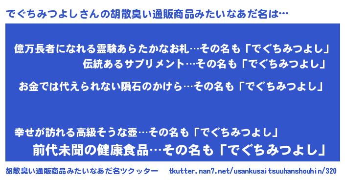 | ヒーロー風カッコイイあだ名 | 『慈愛の使者でぐちみつよし』 |