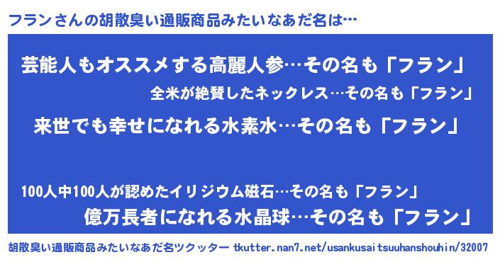 | 意味不明あだ名 | 『もやし科フラン属』『永久保存フラン』 |
