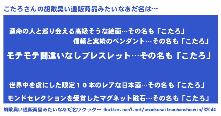 | 男性向けラノベタイトル風あだ名 | 『こたろの憂鬱』『魔弾の王とこたろ』 |