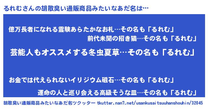 | 男性向けラノベタイトル風あだ名 | 『Re:るれむから始める異世界生活』 |