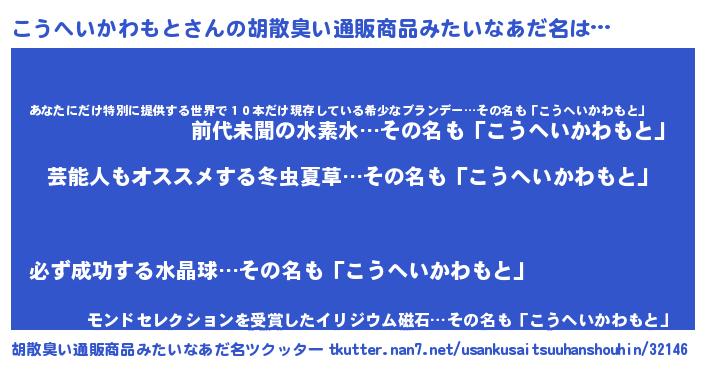 | 男性向けラノベタイトル風あだ名 | 『Re:こうへいかわもとから始める異世界生活』 |