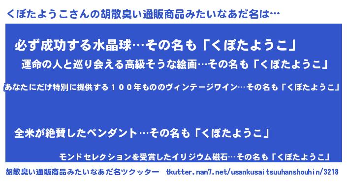 | 男性向けラノベタイトル風あだ名 | 『この素晴らしい世界にくぼたようこを!』 |