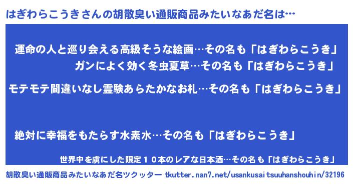 | ヘコむあだ名 | 『はぎっふぃ~』『つくし』『はぎを』 |