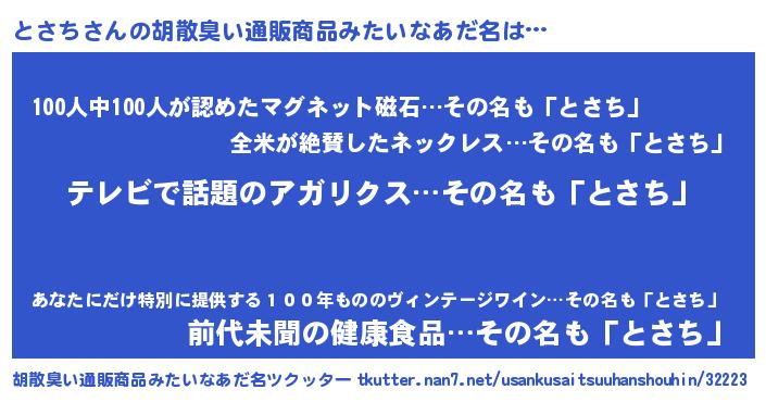 | 男性向けラノベタイトル風あだ名 | 『とさちに滅ぼされるだけの簡単なお仕事です』 |