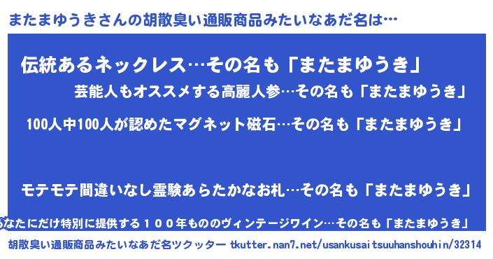| 男性向けラノベタイトル風あだ名 | 『おまえをオタクにしてやるから、俺をまたまゆうきにしてくれ! 』 |
