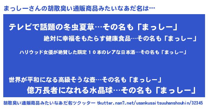 | 男性向けラノベタイトル風あだ名 | 『魔弾の王とまっしー』『まっしーの憂鬱』 |